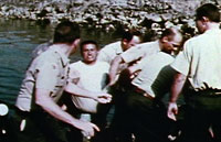 Washington state officials tell us that Indians are renegades and poachers who take fish away from legitimate fisherman. Sue says, “Tacoma had open season, I mean shooting Indians.” Valerie comments, “I think the fishing issue was to Washington State what busing was to the East.” We see Billy, his nieces, Hank, Sue and others staging fish-ins on State Capitol steps. Marlon Brando, Dick Gregory, and Buffy Sainte-Marie journey to Frank’s Landing to register support. Suzette Bridges screams passionately into a megaphone. Allison, the other sister, sorrowfully exclaims about both the federal and state governments, “They’d just as soon kill us as look at us.”