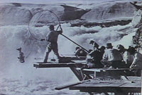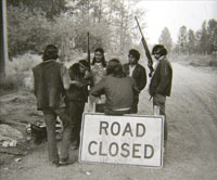 We move back and forth through time using archival footage of salmon fishing and the “fish wars,” present-day interviews, and Valerie’s voice over. Valerie tells us about the original treaty that was the basis for the Boldt decision. “Over a hundred years ago, my ancestors came down to Nisqually to sign the Treaty of Medicine Creek. This was Washington Territory then, and the whites convinced the Indians to trade their lands in exchange for the right to fish in all the usual and accustomed places. This wasn’t the way it worked out.” This informal storytelling conveys some of the more complicated historical aspects as well as the intimate lives of the Frank and Bridges families. As we hear Valerie’s voice, we see paintings of 1850s Washington Territory— Indians trading, white farmers, Chief Leschi, and Governor Stevens, known for bragging, “I can get these Indians to sign their own death warrants.” Valerie tells us how Stevens insisted on negotiating in an unfamiliar dialect; consequently the treaty relegated the tribes to a small area of land without river access. Because of this, Chief Leschi led a rebellion–and was wrongfully hanged by Stevens in 1858. Over a montage of family photographs, we hear how the story of Leschi was passed from one generation to the next, how Billy’s grandfather, then a small boy, was present at the awful hanging. The scene ends at the site of the 1854 treaty signing: the Treaty Tree today is a snag but still upright. Valerie hints at the irony that the Treaty of Medicine Creek became the weapon with which Northwest Indians eventually won legal affirmation of their fishing rights. 1940s and ‘50s archival footage shows the booming growth of the Seattle/Tacoma area, the voracious timber industry, and the depleted salmon and their habitat. Valerie explains that the state began to blame the Indians for the loss of the salmon harvest. Thus began the “fish wars.”